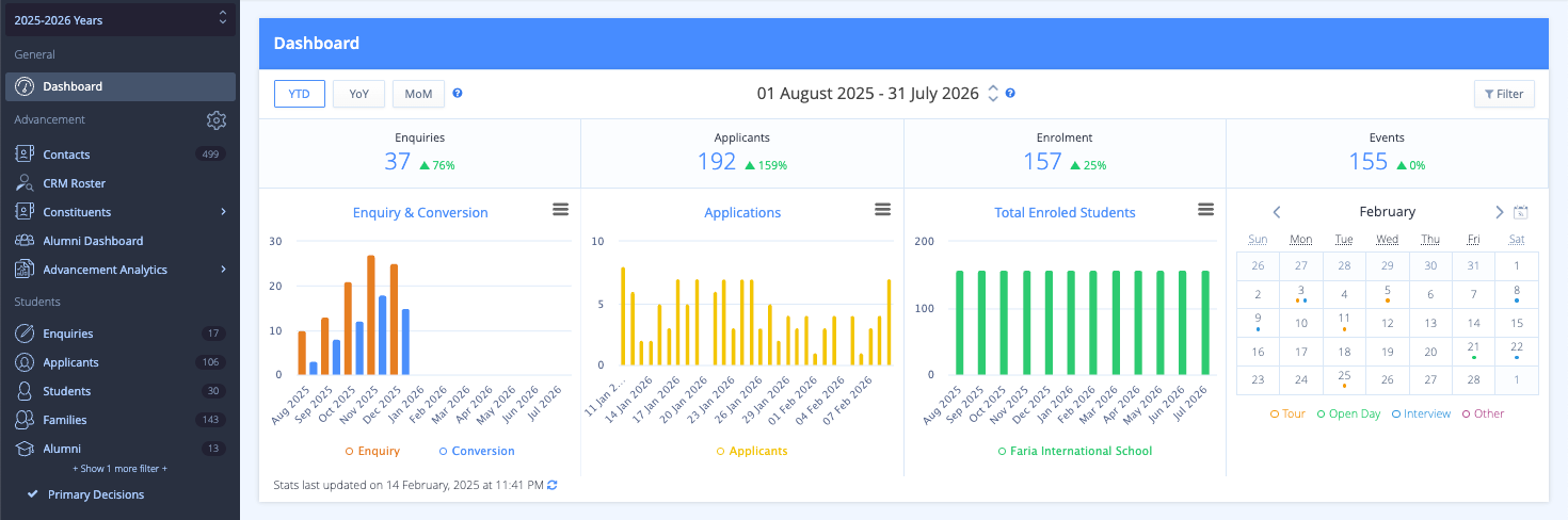 For example, the Enquiries & Conversions chart displays how many families enquired or applied during each month within the selected academic year. However, these applications could be for any academic year.