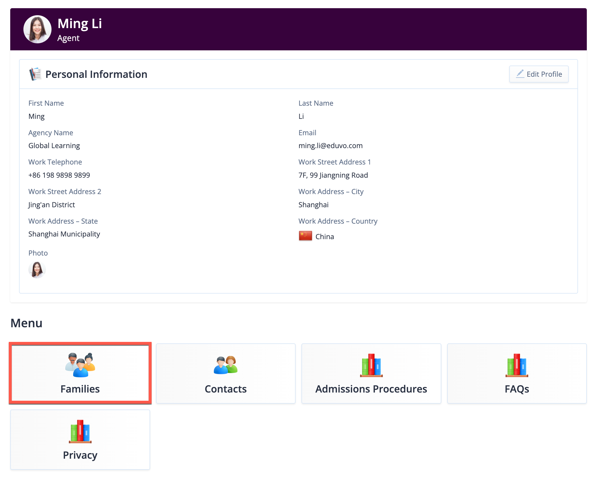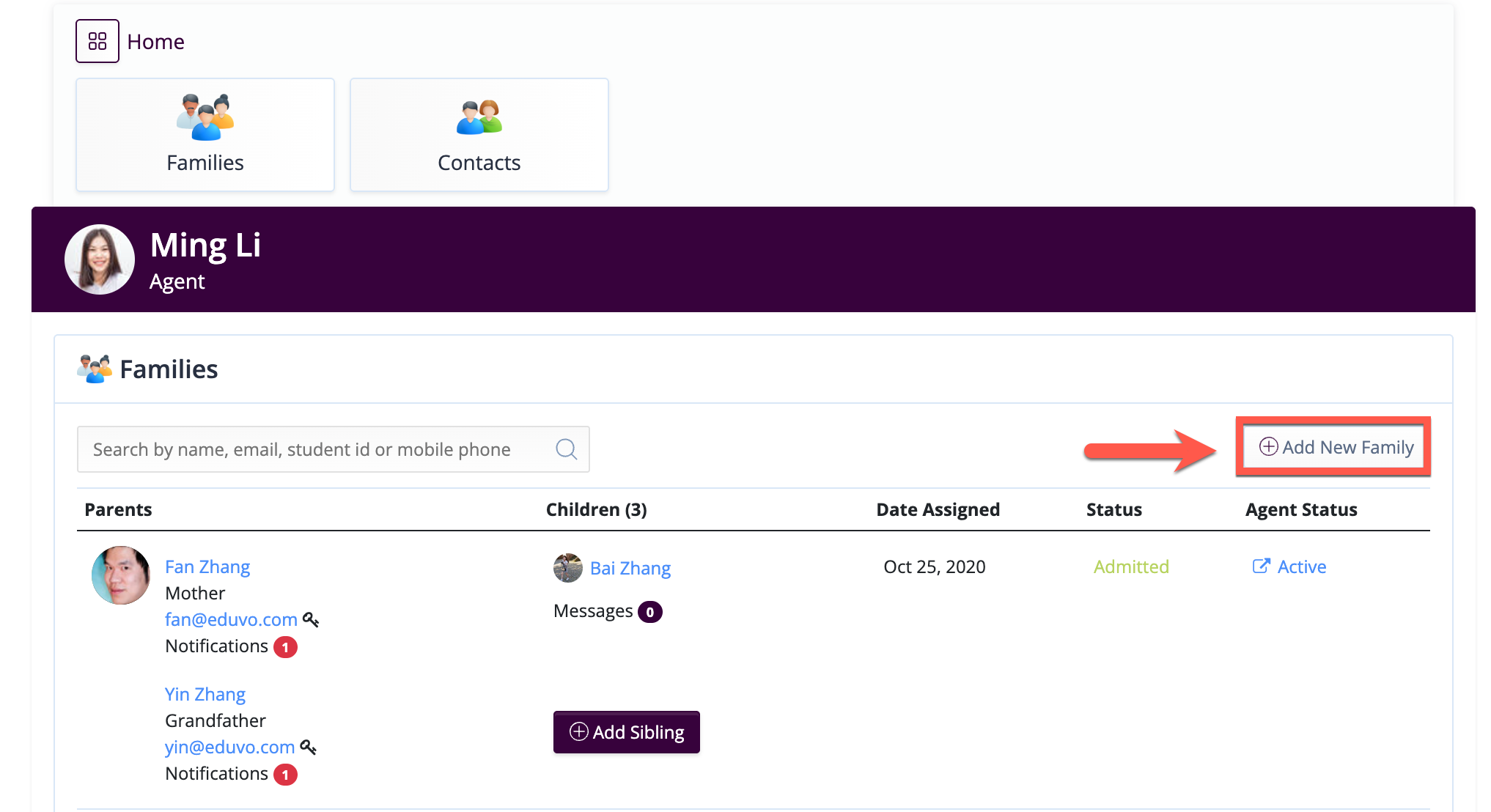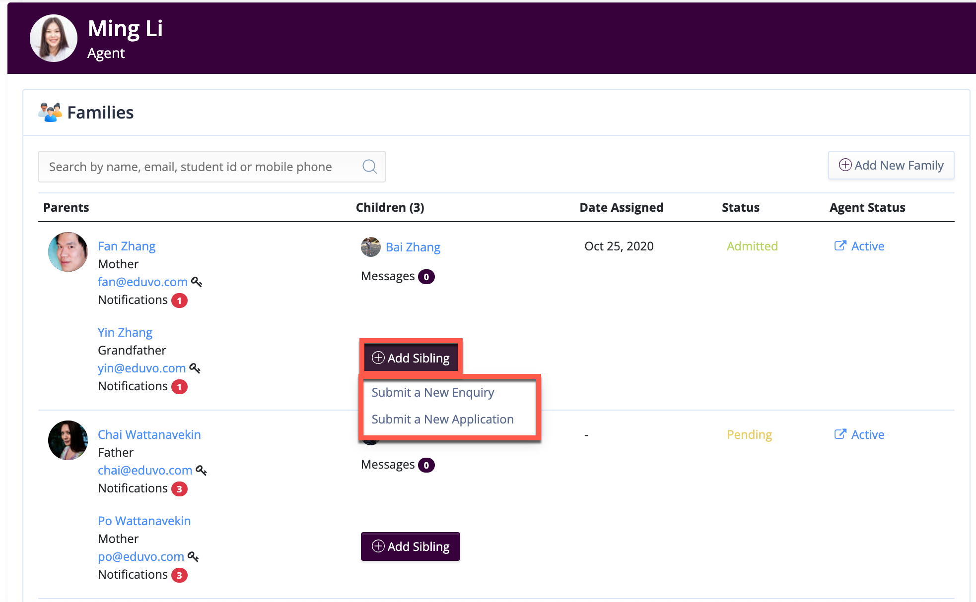 If you are an agent working with a new family who is interested in applying to the school, you will be able to complete additional applications or enquiries via your Agent Dashboard. When logged into your Agent account, click Dashboard on the top left and Add New Family to start a new application or enquiry.
