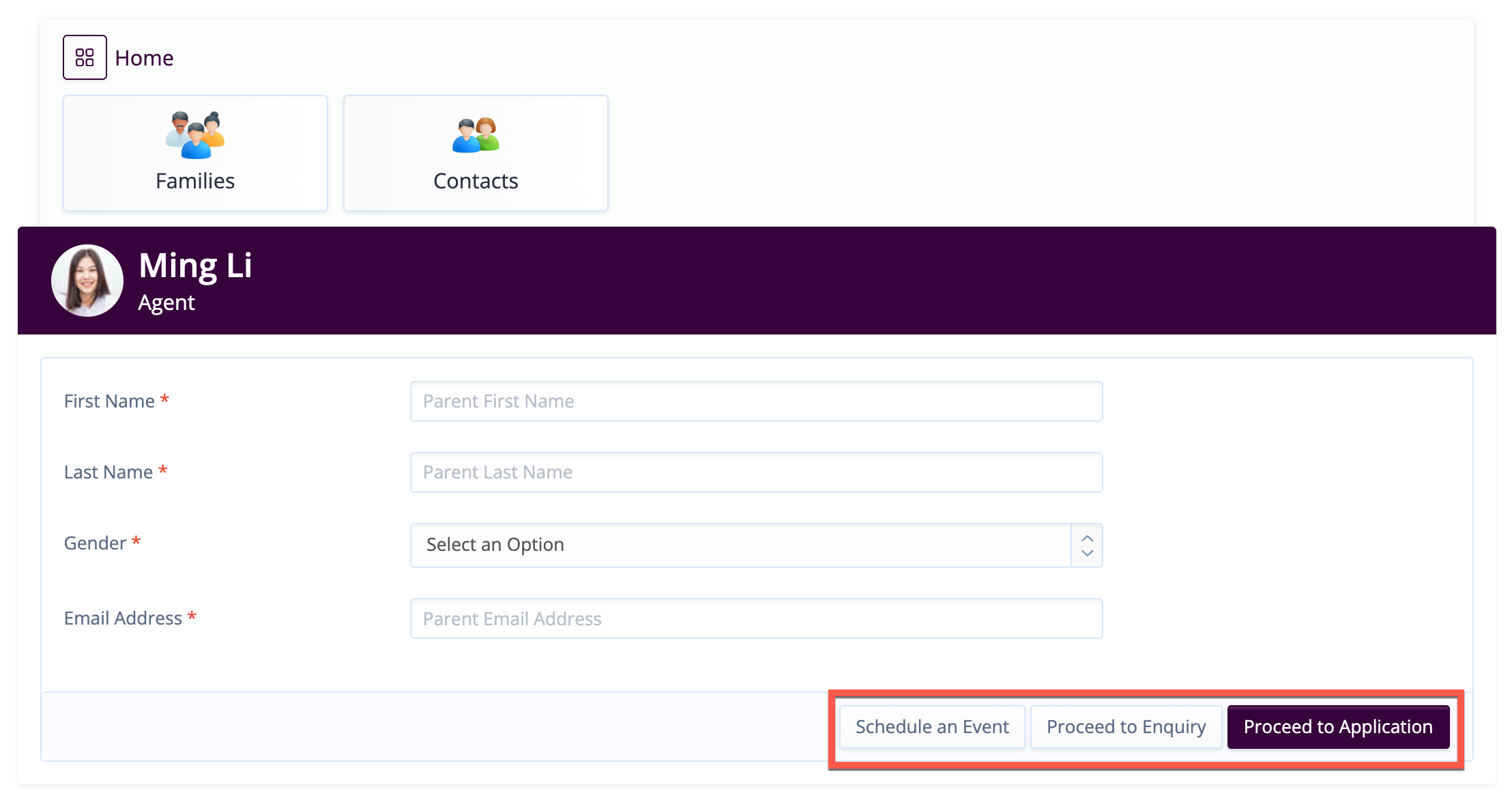 Please note that Schedule an Event will only be available if the school allows parents and agents to register for tours or open days. The Enquiry will only be available if the school has the Registration of Interest form enabled. The Application will only be available if the school has the application form set to display on their landing page. Some schools require an enquiry to be submitted before proceeding to application.
