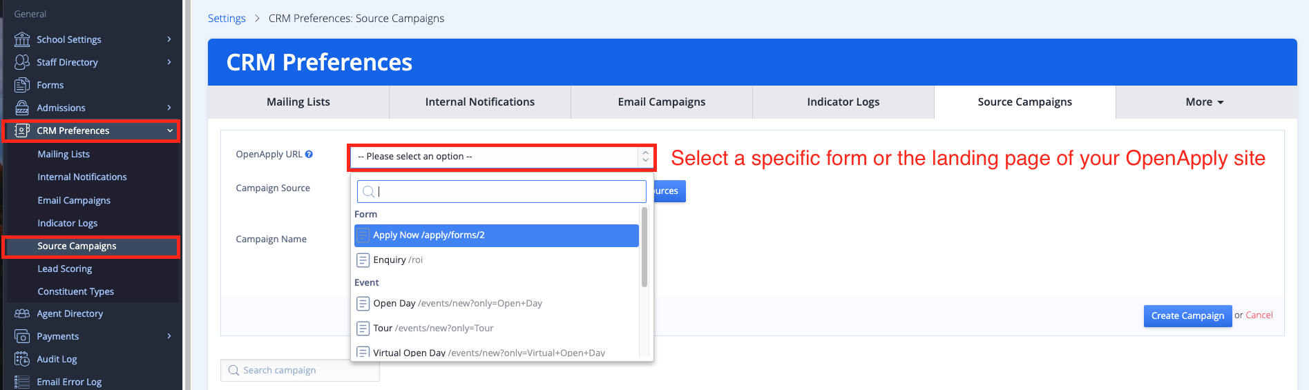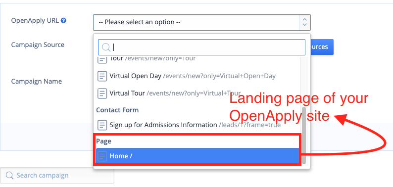 - Choose whether the campaign URL should direct visitors to a specific form or to your main OpenApply site.