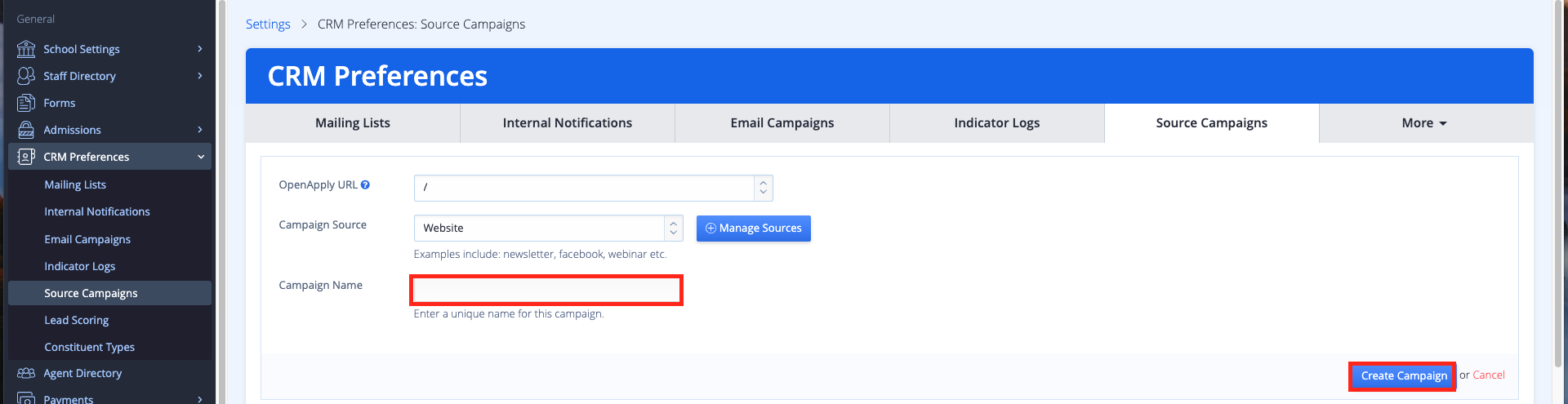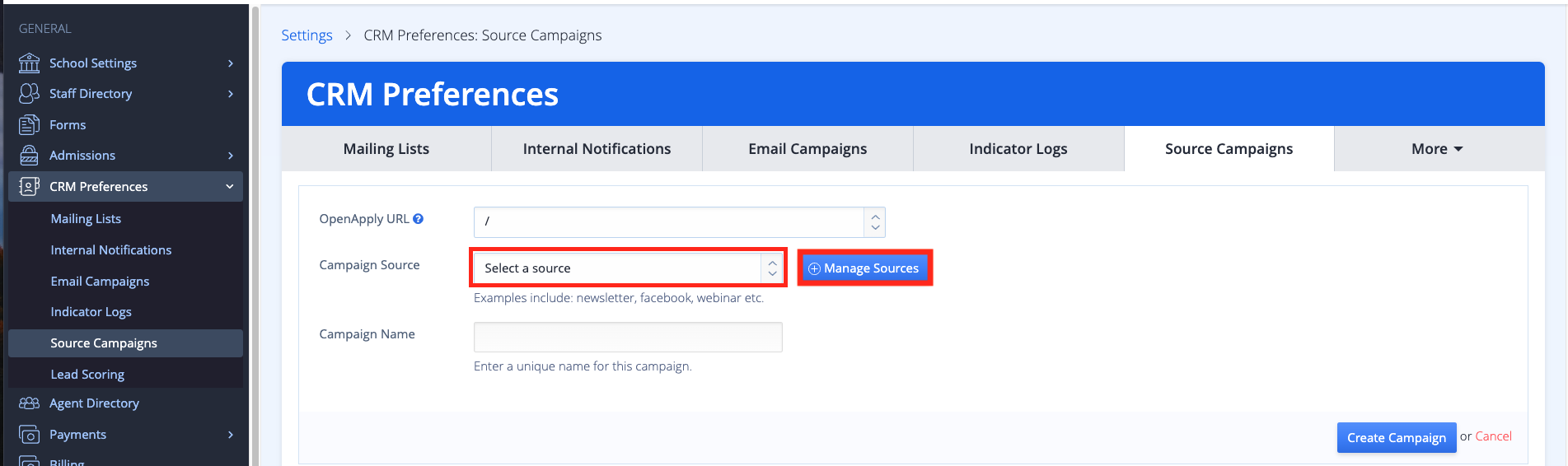 - Navigate to Settings > CRM Preferences > Source Campaigns.