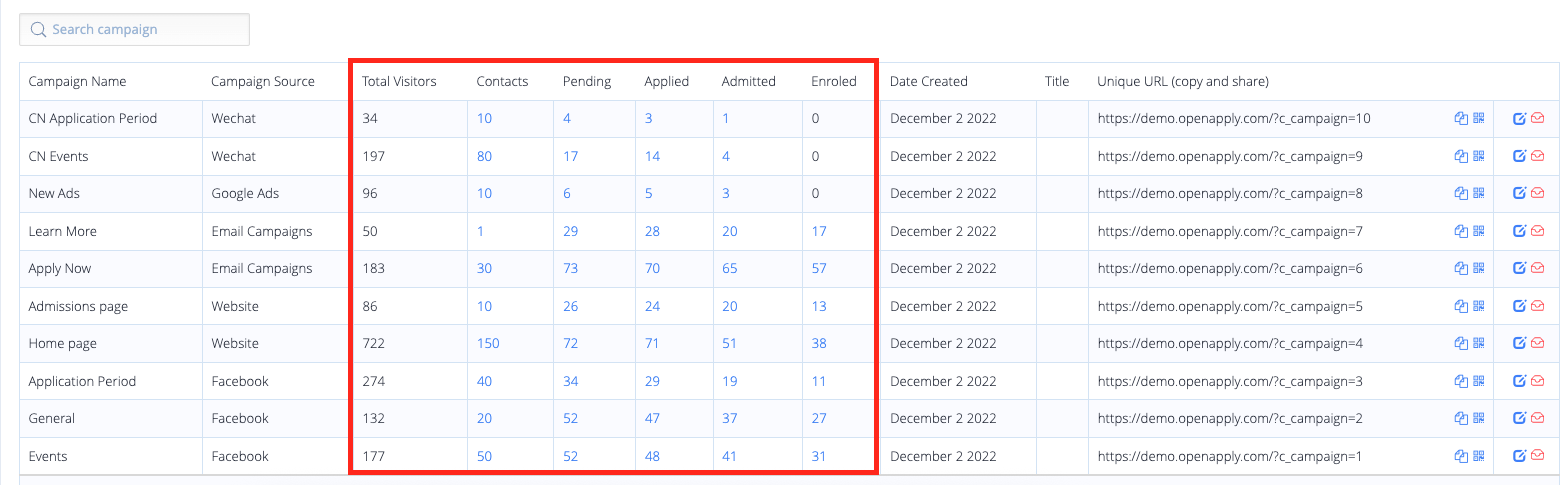 A Source Campaign in OpenApply enables you to track where visitors are coming from when they access your OpenApply site or a specific form. When you create a campaign, the system generates a unique URL that can be shared across various channels, such as social media posts or digital advertisements. OpenApply then tracks user engagement with that link, including whether visitors submit an enquiry or complete an application.