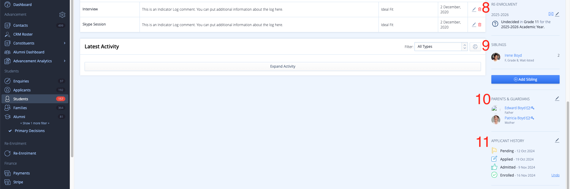 - Audit Log – the Audit Log shows a timeline of changes made to a student's core details, such as Status changes (e.g., from "Applied" to "Admitted"), Application form submissions and Edits to personal information like name or address. This log provides a transparent record of when and how student data has been updated.