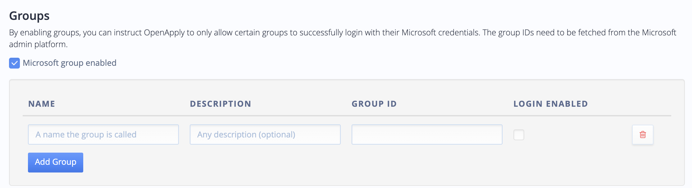 By enabling groups, you can instruct OpenApply to only allow certain groups to successfully login with their Microsoft credentials. The group IDs need to be fetched from the Microsoft admin platform. For validation, the name cannot be empty string or blank. The description can be optional or blank.