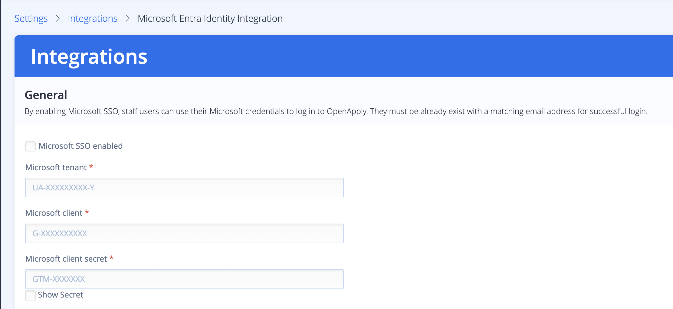 By enabling Microsoft SSO, admin users can use their Microsoft credentials to log in to OpenApply. They must be already exist in OpenApply with a matching email address for successful login.